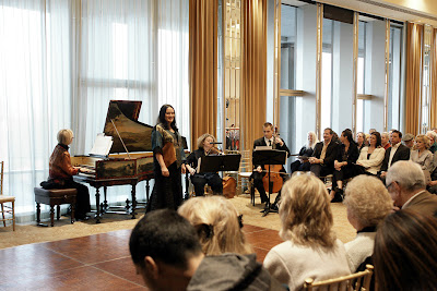 That the audience members are up-close-and-personal with the musicians is part of the appeal, along with the après concert fare: free-flowing champagne and hors d’oeuvres, the latter courtesy of Patina. Past concerts have included music of Brahms, Schubert, Mozart and the usual suspects, while the most recent offering, an all-Baroque program meant to recreate a salon in Versailles during the court of Louix XIV (left), also featured a pair of dancers.